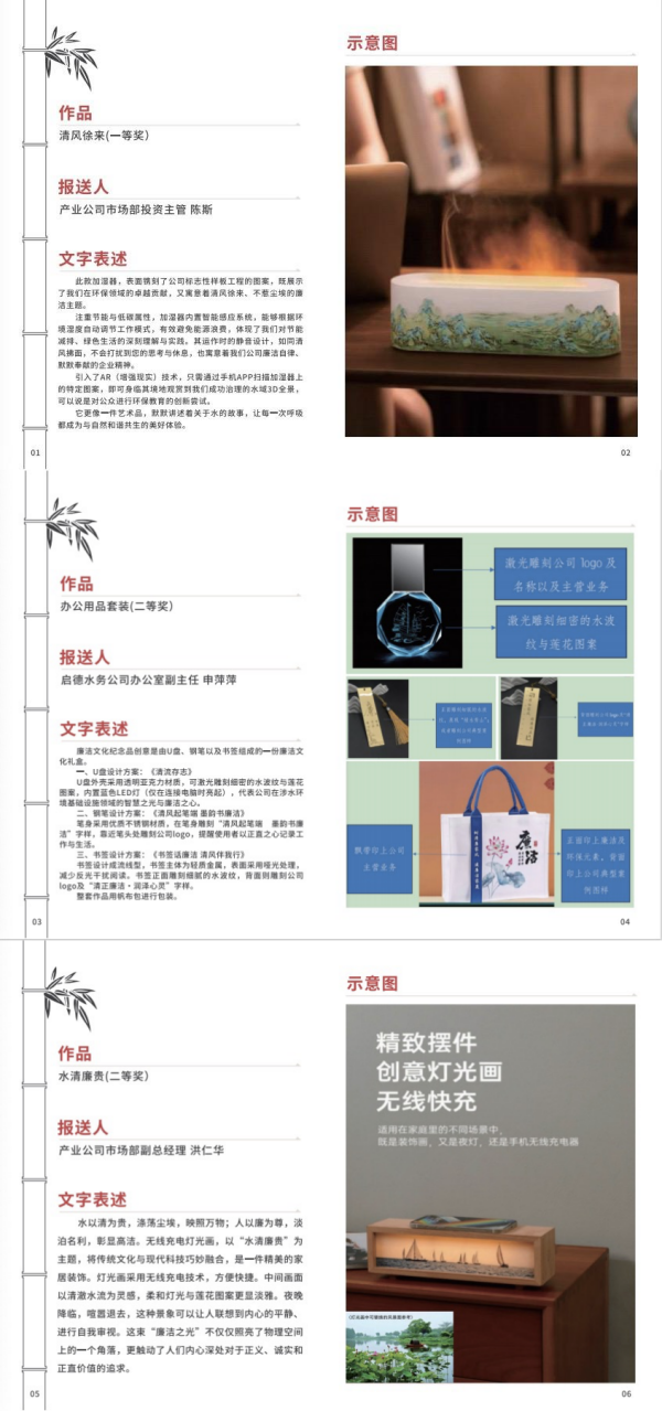 本次活動以“清風廉韻 匠心傳承”為主題,通過全員參與、寓教于創的形式,深度挖掘廉潔文化創意內涵,可謂是一場精彩絕倫的思想碰撞。投稿作品涵蓋了辦公用品、文創擺件、數字產品、生活家居等多個領域,融匯了蓮花、翠竹、清泉、水晶、茶葉等多種廉潔文化符號,彰顯了廉潔主題和公司主責主業,廉潔創意與實物載體相結合,具有較好的使用價值和警示教育意義。其中一等獎作品《清風徐來》創意,以加濕器為載體,通過巧妙的構思融入廉潔元素和公司主業,既傳達了節能低碳的環保理念,又運用AR技術和內置感應系統,展示產業公司在涉水環保領域所做出的卓越貢獻,向使用者生動講述了關于水和廉潔的故事,也讓每一次呼吸都成為人與自然和諧共生的美好體驗。